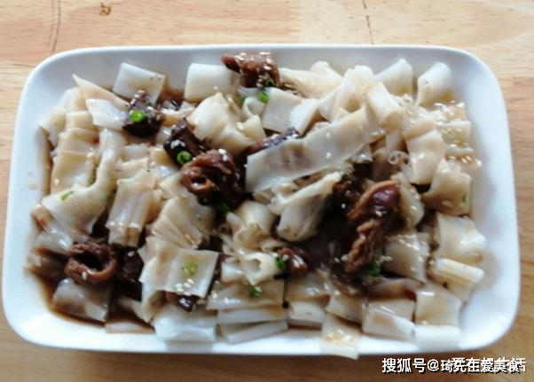 第七道是“拌”:根据个人喜好拌入花生油、酱油、葱花、醋、酸辣椒、芝麻等;或把炒熟的新鲜猪杂、猪肉连同芡汁均匀地淋洒在竹篙粉上,让粉充分吸肉汁。