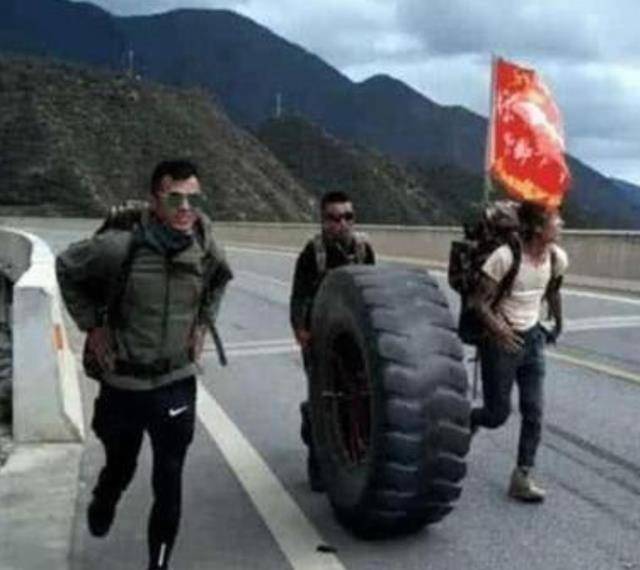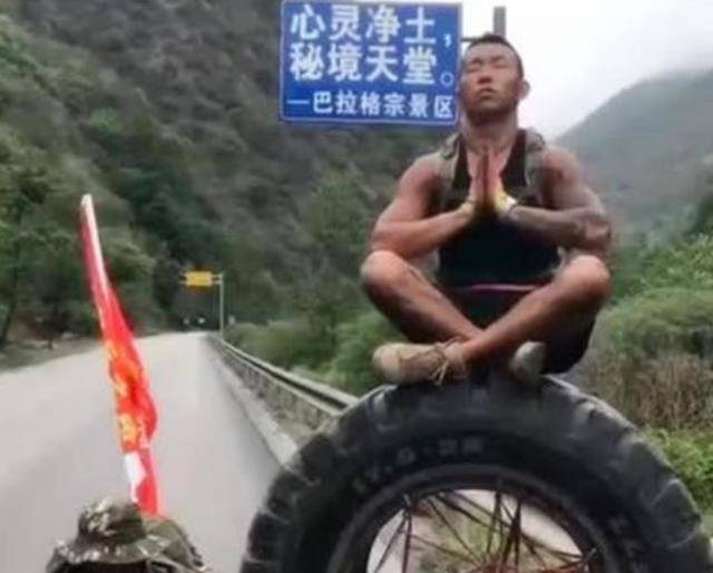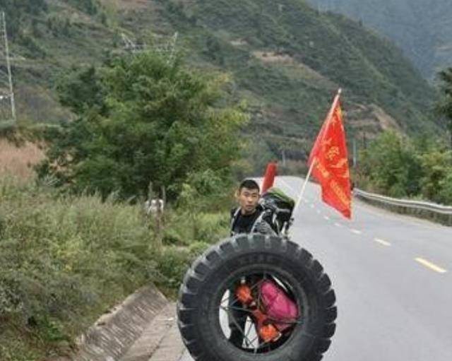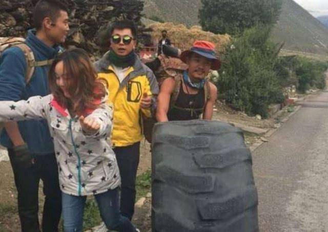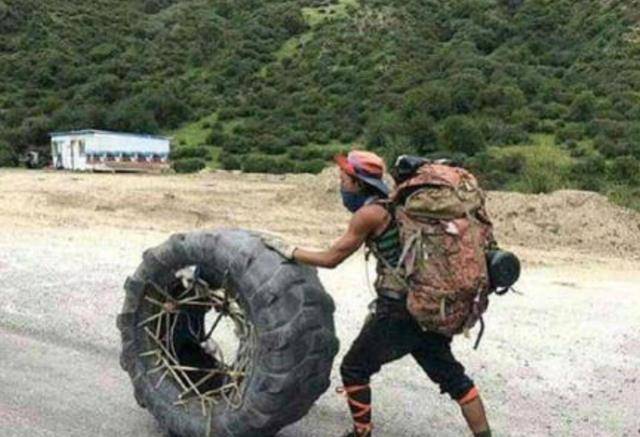 不过,到了今天,荒凉的川藏线上,不仅有汽车、有草木、有公路,我们还可以见到一条独特的“风景线”:滚轮胎的人。