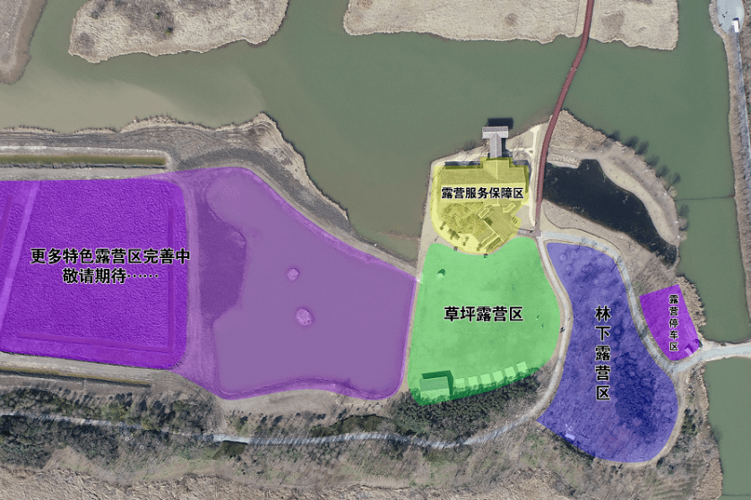 东滩湿地公园星野营地位于园区芳草地, 其中,草坪露营区3500平米,林下露营区2000平米,滨水露营区数百平米,同时也为游客提供卫生间、热水淋浴及无人售卖等服务。露营区周边风景优美