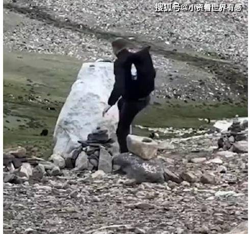 网传外籍男子踢倒藏区玛尼堆(网络视频截图)