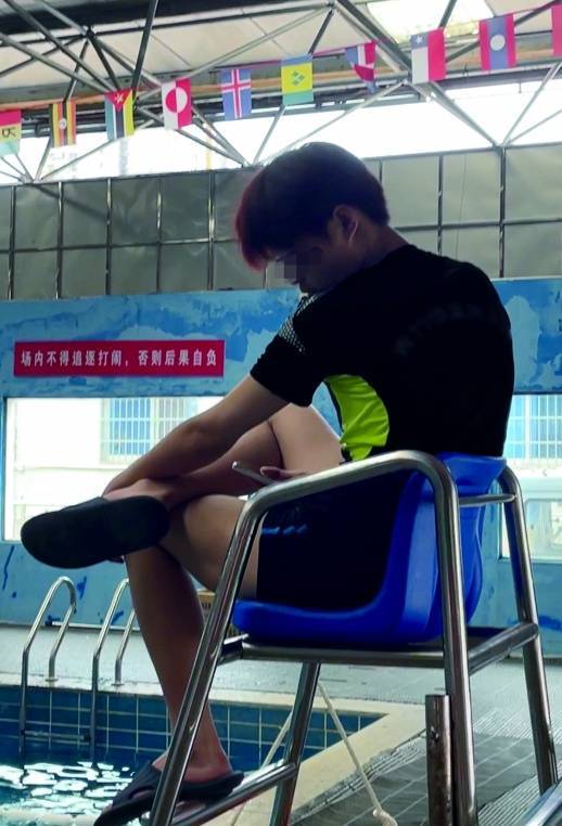 长沙雨花区森雾游泳馆内,一名在岗的救生员正低头看手机。