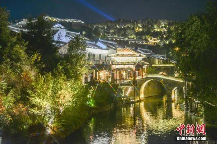 资料图:位于北京市密云区古北口镇司马台村的古北水镇景区灯火绚丽,夜色璀璨。中新社发 冯军 摄