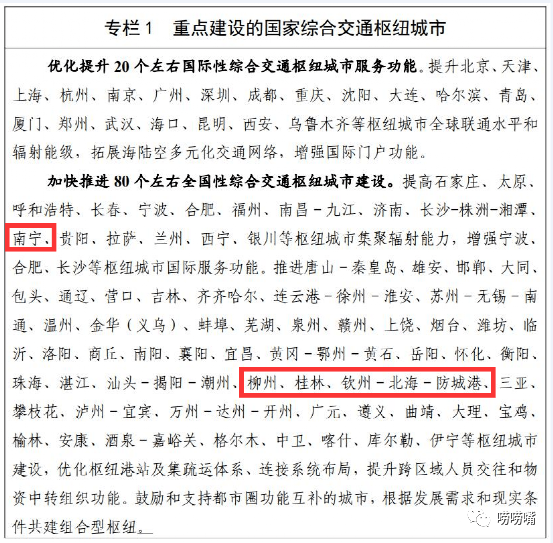 为了更快更好的发展广西,中央继续为广西赋能,选定广西6市,建4个全国综合交通枢纽城市,即南宁、柳州、桂林、钦州-北海-防城港,从选择的交通枢纽分布来看,南宁较居广西中部,柳州、桂林较居广西北部,钦州-北海-防城港居广西南部,缺了东西,百色、梧州落选有点遗憾。