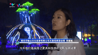 潍坊浮烟山文化投资有限公司李媛媛说:今年我们采用了更具科技感的观影技术效果,团队也是历时两个月来打造这么一个超梦幻的夜间空间。整个园区10万平,有20多个打卡地,不同地来呈现夜间活动,像我们现在的这个20多个节目,有特别适合老年人的,也有适合小孩的,侏罗纪孔园啊,还有像刚才咱们第一个园区的这个霓虹灯,有当下年轻人比较喜欢的一些语录,包括诗词歌赋,我们都会打造成一个打卡点来吸引更多的年轻人,包括小孩老人,满足不同年龄阶段游客的需求。