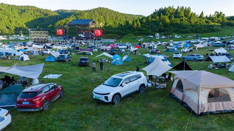 晚上6点,晚会还未开始,游客们早早就在清凉的草地上支起帐篷,撑起天幕,吃着美食静候音乐晚会开始。今年仙女山“影院式”露营模式可谓是相当吸睛,游客们可以开车直达音乐节现场,在舞台周围寻觅一处草地便可安营扎寨,谁也不挡着谁看音乐演出。白天尽情地享受大自然的清风荡漾,傍晚听最炫酷的音乐,夜晚伴着漫天星星入眠,浪漫又惬意。
