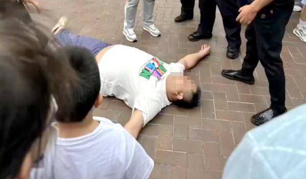 ▲一男子与迪士尼工作人员起冲突,看到民警到来就躺地上。 图片来源/网络