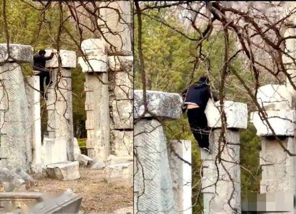 今年3月,一组游客不文明行为的视频被传到网上。视频画面显示,多名男子跨越围栏,进入圆明园大水法遗址内部,而旁边就竖着“请勿入内”的提示牌。其中一人攀爬到几米高的石柱残骸顶部,盘腿坐下,让同伴拍照,同行的其他人则站在下面哄笑。工作人员发现后,对其进行阻止和教育。