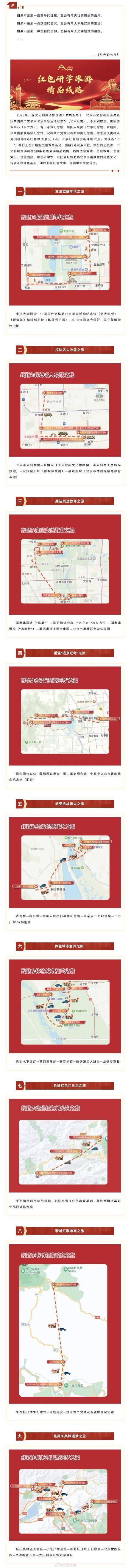2023年,在文化和旅游部资源开发司指导下,北京市文化和旅游局选定中国共产党早期北京革命活动纪念馆(北大红楼)、李大钊故居、国家游泳中心(水立方)、香山革命纪念馆、中国人民抗日战争纪念馆、首钢园、平西情报联络站纪念馆、没有共产党就没有新中国纪念馆、北京延庆奥林匹克园区等9处红色旅游景区(点)开展红色研学新课程试点。为庆祝“七一”,结合正在开展的主题教育活动,围绕9处试点单位,集合周边资源,市文化和旅游局推出9条红色旅游精品线路,线路适合党建、主题教育、主题党日、企业团建、学生研学等,以此更好地弘扬北京丰富厚重的红色文化,传承革命红色基因,讲好北京红色故事,增强中华文化自信。