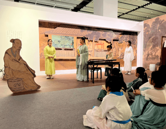 中国园林博物馆依托本馆丰富的园林资源及《长物·居园》主题展览等展览展陈空间,于每周三开展“遇见未来演说家”夜宿博物馆活动。青少年可以扮演王羲之、白居易等多位历史人物,参加集中研学课程、体验雅集社教活动,运用自身搜集到的人物线索与所学知识,向其他师生呈现以“曲水流觞”为背景的故事演剧,沉浸式品味古代文人在园林中的风趣雅致。