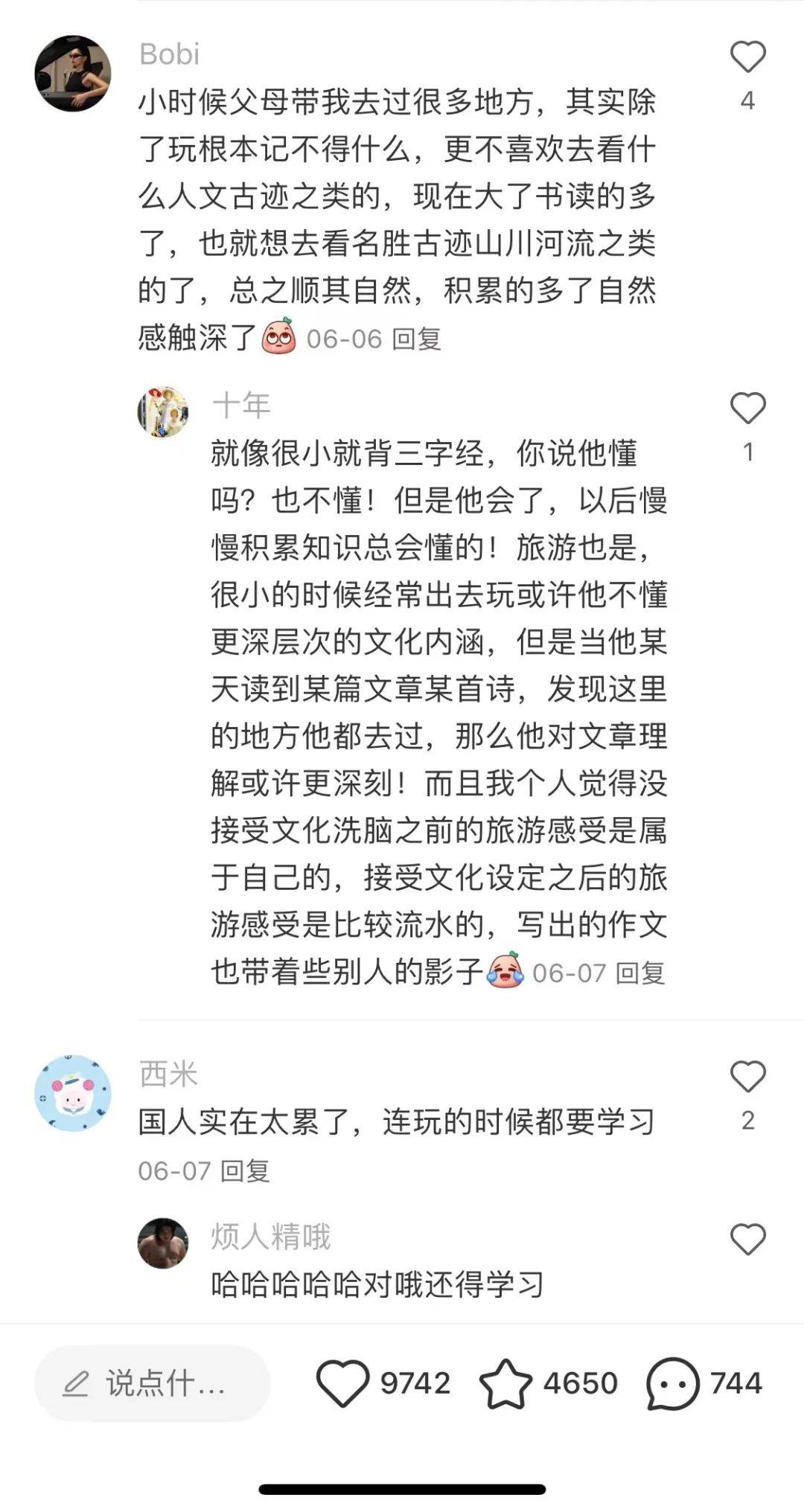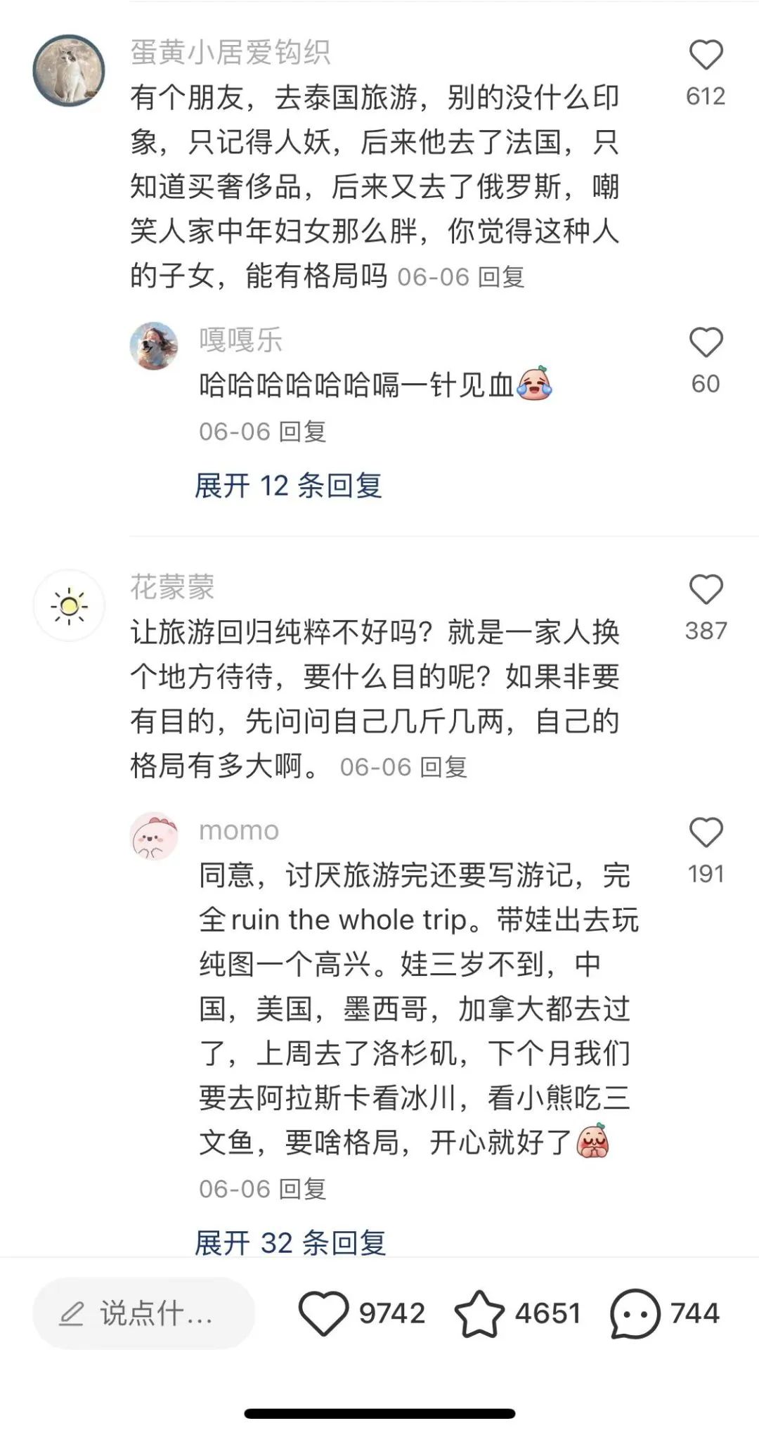 网友们纷纷发表自己的意见,其中一条回复获得了高赞:“出门去玩,本质是娱乐;让孩子长见识,本质是教育,两者截然不同。”