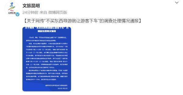 7月22日,昆明文旅微信公众号发布关于网传“不买东西导游就让游客下车”的调查处理情况通报。