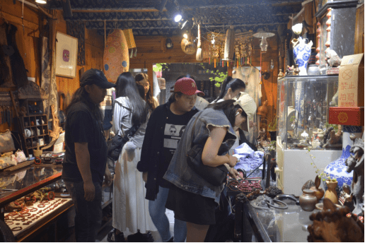 位于古镇西街的贵州非遗元素馆内,老板陈茂超正忙着接待不断涌入的客人。“我这个店里浓缩了非常多的贵州非物质文化遗产内容,这些蜡染和绣品都非常能代表贵州元素,楼上还有很多,你们可以上去看看。”