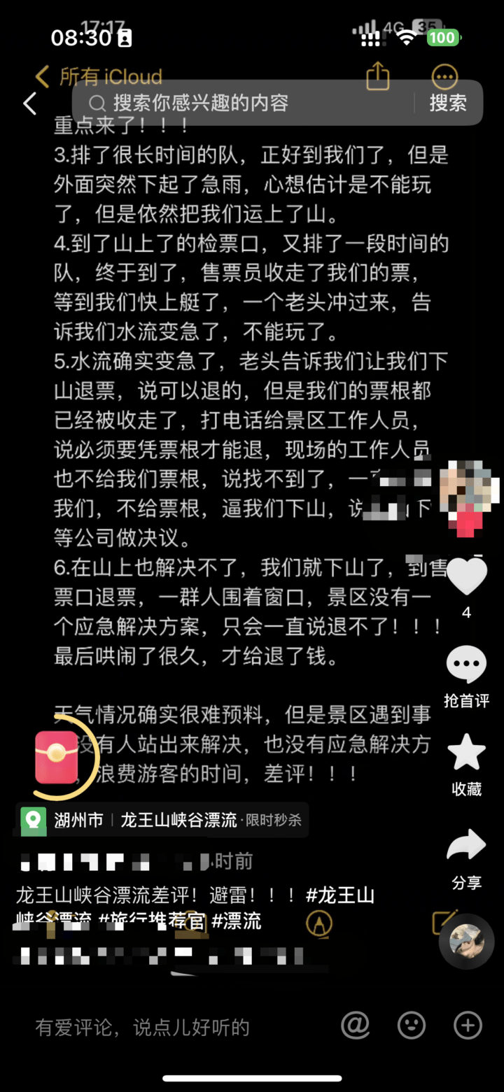 “昨天在湖州安吉龙王山峡谷原本准备漂流,下午1点突然下起了急雨。到了山上的检票口,原本准备检票上艇又突然被通知水流湍急不能漂流。”