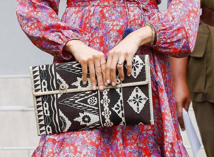 抛开梅根的衣着功夫不谈,精致的王妃所穿的包包和配饰也是精挑细选,颇能说明问题。梅根手中的文件夹状手提包是用斐济产的布料(也称为塔帕)制成的。梅根左手腕上佩戴的优雅金蛇手镯也是由顶级珠宝商ShaunLeane手工制作,价格昂贵。