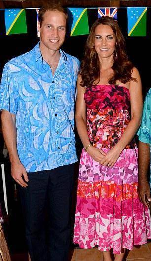哈里·王子当天也穿了一件花衬衫,与梅根的一幕让人想起2012年威廉·王子和凯特·王妃访问所罗门群岛时,当时他们穿着几乎一模一样的衣服。