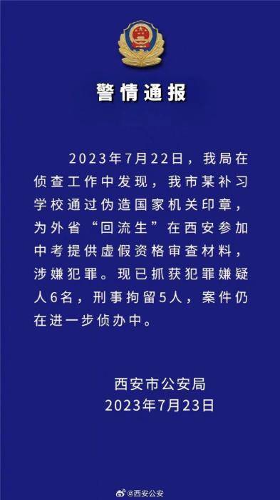 中新网7月23日电 据陕西省西安市公安局官方微博消息,西安市公安局23日发布警情通报称,2023年7月22日,该局在侦查工作中发现,西安市某补习学校通过伪造国家机关印章,为外省“回流生”在西安参加中考提供虚假资格审查材料,涉嫌犯罪。现已抓获犯罪嫌疑人6名,刑事拘留5人,案件仍在进一步侦办中。