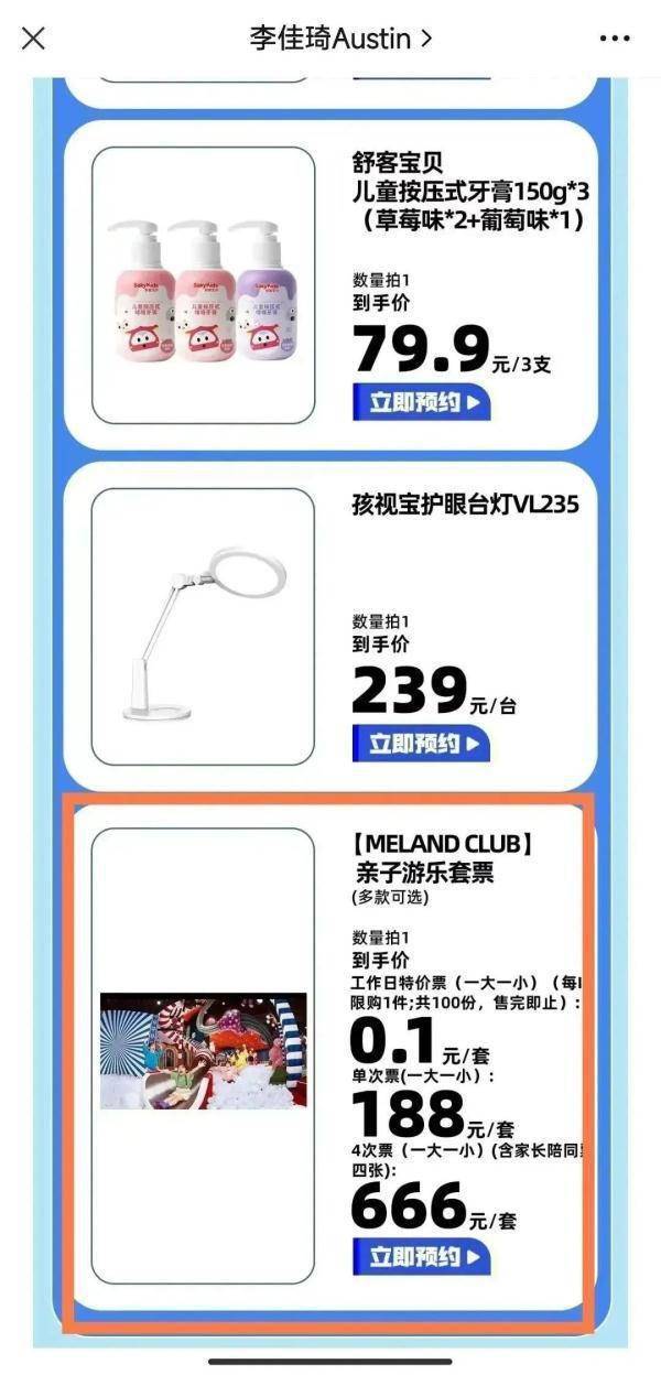 7月20日是淘宝“李佳琦Austin”直播间的母婴节,当天下午1点51分,“李佳琦Austin”微信公众号推送当晚直播预告,“MELANDCLUB亲子游乐套票”秒杀位列其中,包括工作日特价票(一大一小)(每ID限购1件,共100份,售完即止),0.1元/套;单次票(一大一小),188元/套;4次票(一大一小,含家长陪同票四张),666元/套。