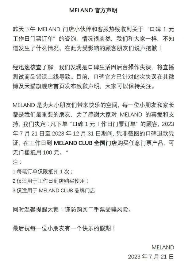 在表达歉意的同时,MELAND表示,凡下单“口碑1元工作日门票订单”的顾客,7月21日至12月31日凭非截图的口碑退款凭证,在工作日到MELANDCLUB全国门店购买任意门票产品,可无门槛抵用100元。