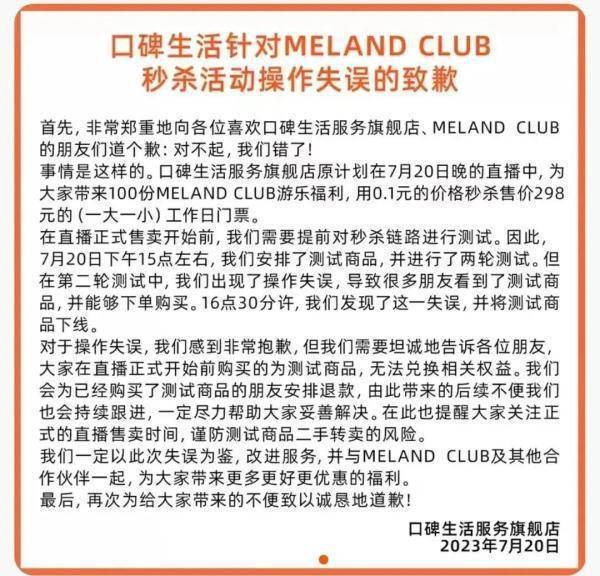 信中称,原计划在7月20日晚的直播间设置100份MELANDCLUB游乐福利,因为直播正式售卖前需要提前测试秒杀链路,因此当天下午3点左右安排了测试商品,并进行了两轮测试。“在第二轮测试中,我们出现了操作失误。”