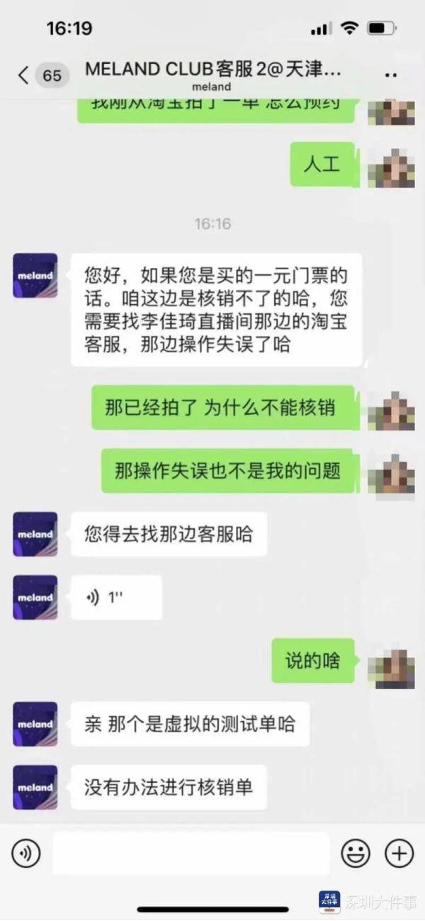 不过,有消费者找MELANDCLUB客服咨询预约事宜时,被告知无法核销,因为购买的是虚拟测试单,需要找到李佳琦直播间的淘宝客服处理。