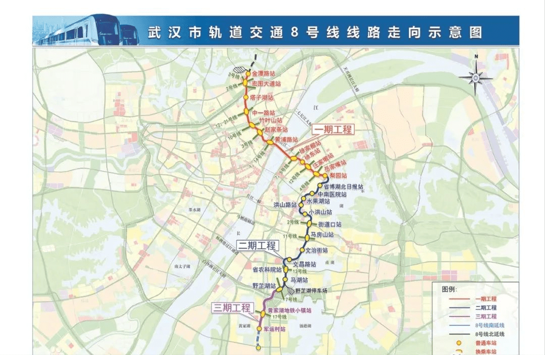 地铁 8 号线是武汉市第三条穿越长江的地铁线路,全长39千米,全部为地下线,共设26座车站,线路连接了汉口后湖、二七滨江,武昌徐东、东湖风景区、水果湖、街道口、南湖、黄家湖等区域,通达性较好。