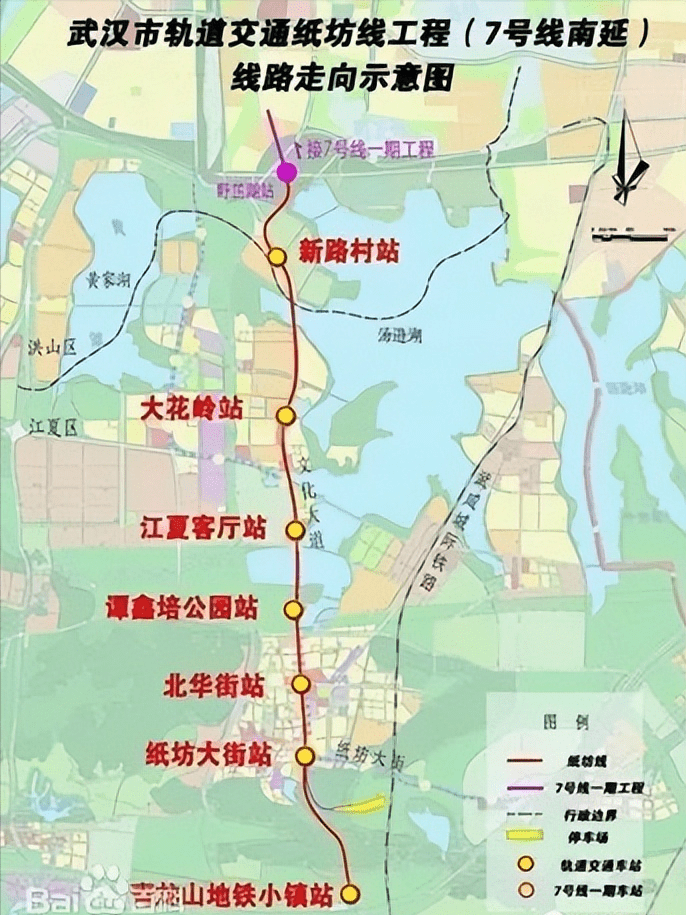 截至2022年12月,武汉地铁7号线全长68.85千米,大致呈南北走向,北起于黄陂区横店站,途经江汉区、江岸区、武昌区、洪山区,南止于江夏区青龙山地铁小镇站。