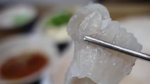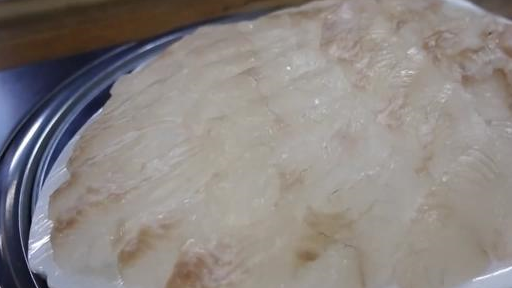 看看这切出来的生鱼片,看着非常美味吧?这生鱼片切出来颜色像是半透明的,看起来真是让人食欲大开啊。