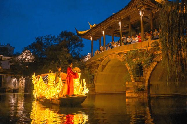 “濮院”,缘起于濮凤的六世孙濮斗南,昔日有从龙之功,被升为吏部侍郎,得赐宅邸于此。守正创新,以新述古,古镇对“濮侍郎”这一历史人物进行深度挖掘,以“侍郎回乡”为故事主线,开展沉浸式演绎活动,集游船巡游、互动表演、想象性与戏剧性于一体,游客可以在景区的百丈连廊码头至濮侍郎码头,与“濮侍郎”惊喜相逢,直接“对话”宋韵历史,绵延近千年的诗情画意。