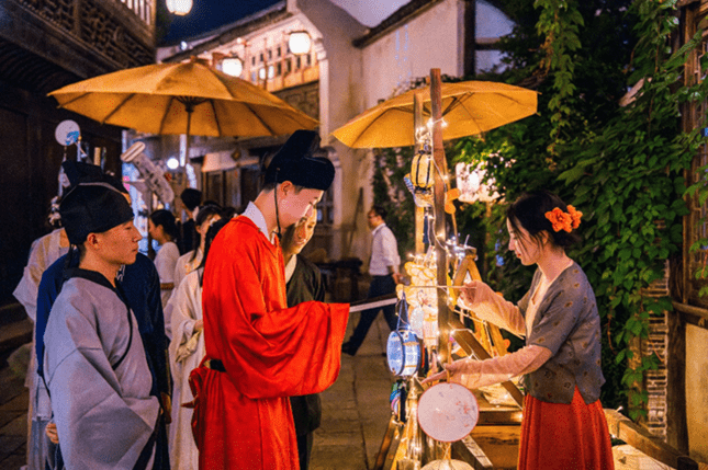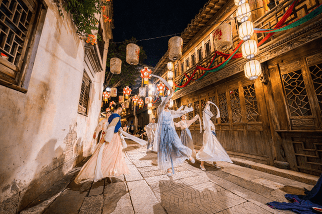 自3月份开业以来,濮院时尚古镇便有机串联了在地文化与时代风尚,举办了濮院时装周、大型主题活动及多场先锋品牌活动,无一不显示着其区别于江南六大古镇之所在。夜幕时分,灯光旖旎的古镇,桐乡三跳、民乐演奏、现代吉他、古典舞蹈、提线木偶……多种表演艺术形式齐聚,让瓦舍说书、岳家大院、陈皮茶食铺等景点“红起来”,缕缕“烟火气”让游客收获幸福感与亲切感兼具的夜游体验。