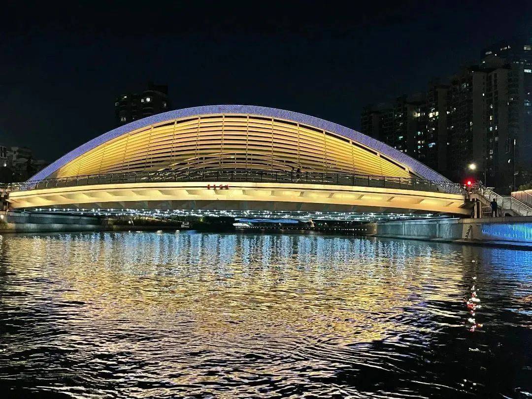 暮色四合,苏州河畔桥上流光溢彩,桥梁映照在水中犹如明眸,又似一轮明月摇曳。近日,有“苏河之眼”之称的昌平路桥完成景观升级,在桥底有序布置了矩阵式灯光,点亮后营造出“暗夜星空”的意境,提升了夜游体验。