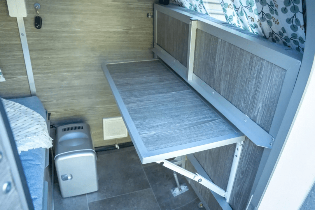 而且床底部可以翻起来贴着前墙,剩余部分就成为一张舒适的长椅。整个mini房车的大小是68公斤,太阳能电池板也可以给你的手机、电脑、相机等物品进行充电。