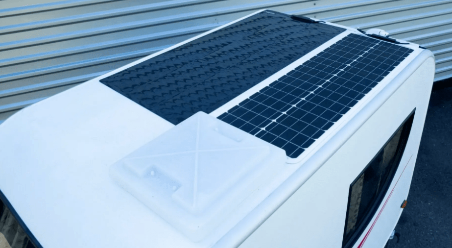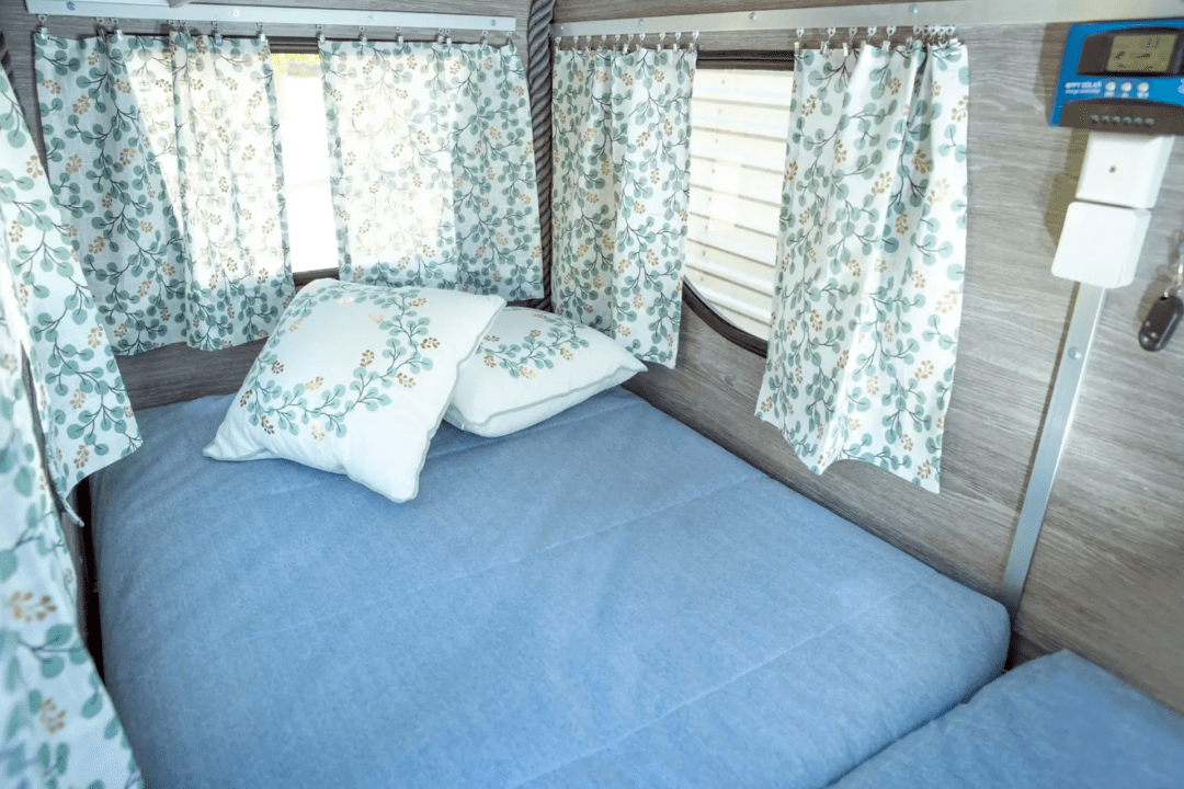 这个露营车自带太阳能发电板,单人床、冰箱、翻转桌等物品,可以轻松被电动自行车拖着走,如果用摩托车拖,那更加轻松了。