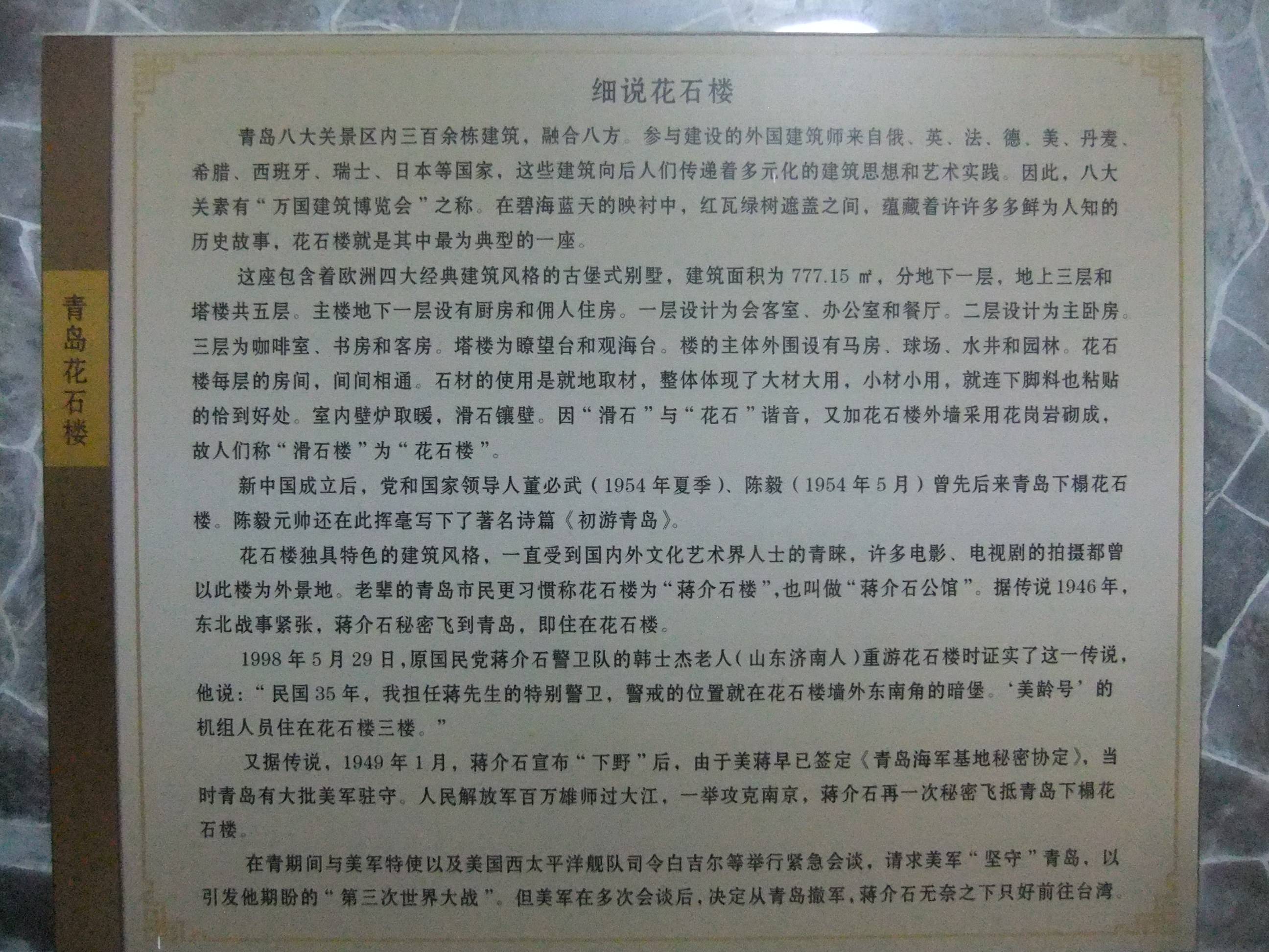 为什么叫花石楼,由于是用花岗岩和鹅卵石建成,故得名花石楼。为欧洲古城堡式风格,有古罗马哥特建筑的遗风,室内有巴洛克、洛克克的痕迹。是八大关中最著名也是最有代表性的一栋别墅。 解放前国民党特务头子戴笠曾在此住过。相传蒋介石曾在这里避过难居住过。解放后,花石楼成为接待中外贵宾的馆舍,董必武、陈毅等党和国家领导人都曾在此下榻。