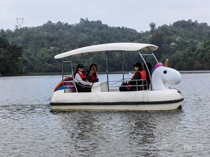 游客泛舟于天竺湖上(央广网见习记者 吴馨骅 摄)