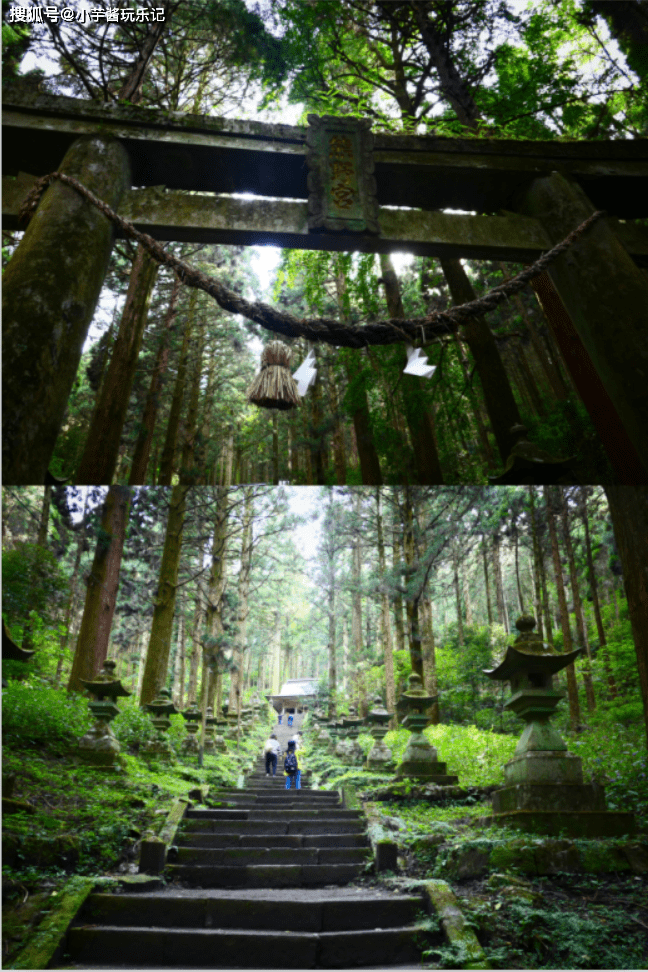 游览:上色见熊野神社不需要门票,我们去的时候正值周末来这里参拜的游客也不少(目测日本当地游客比例更高一些)。一进入神社,瞬间觉得很凉爽,周围有很多的参天大树,顺着石阶一直向上延伸。