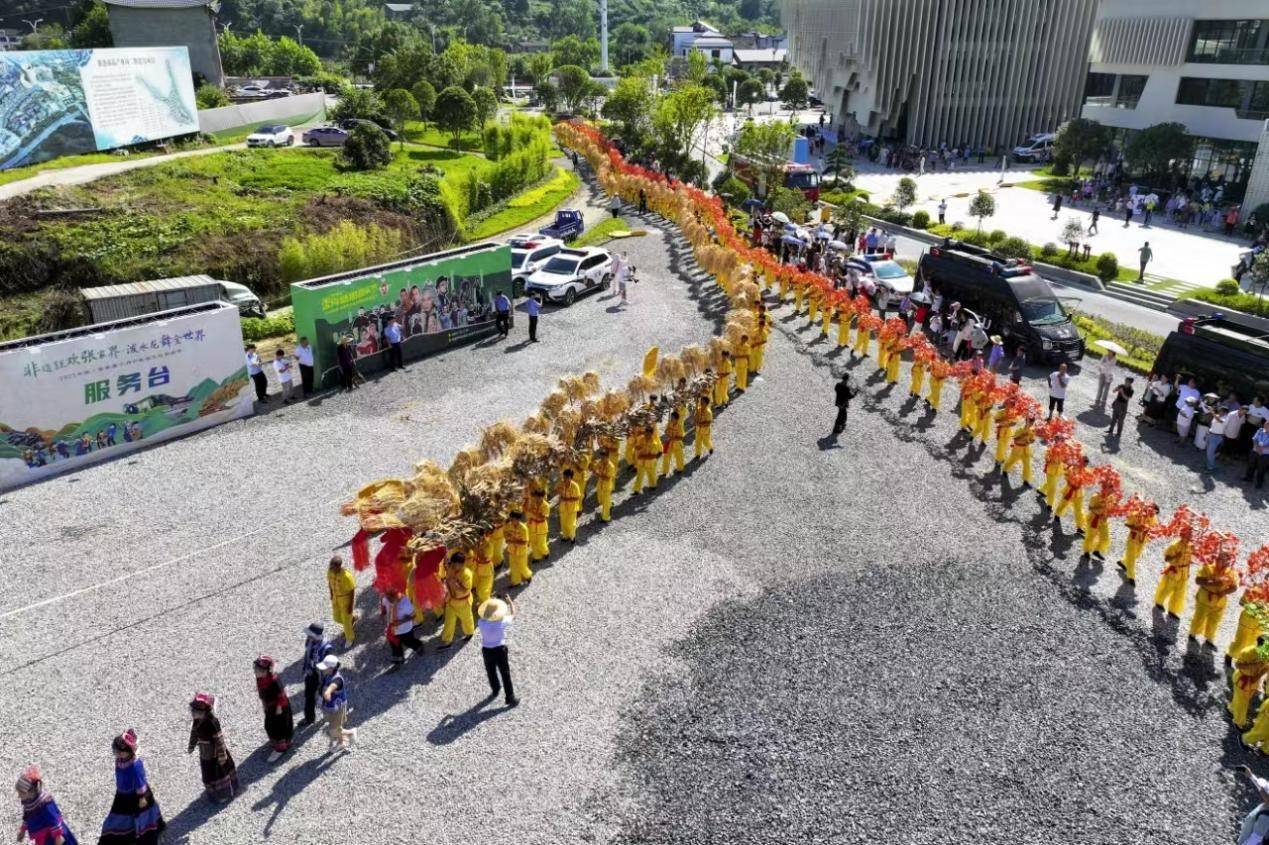 开幕现场,200余位身着民族服饰的土家汉子,抬着两条长达156米的泼水龙入场,成为最具看点的活动之一。该泼水龙由非遗传承人和民间艺人手工扎制,经现场认证,成为基尼斯纪录“最长”泼水龙。