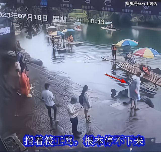 另一边,筏工先有人在劝阻骂人的男子后,连忙把竹筏靠岸,让竹筏上的游客安全上岸。