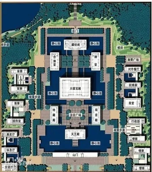 在建筑布局上,采用了现代化建筑形制与传统寺院结构相融合的方式。