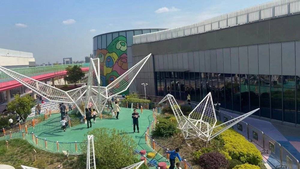 走进商场六层屋顶花园,开阔的“艺术草坪”上布置了天幕帐篷、休闲躺椅、巨型大树气模、叠叠狗装置等,置身其中来一场颇有意趣的屋顶露营;而在“宠物乐园”“彩虹跑道”“儿童乐园”等区域,不同人群均可获取艺术、运动、社交等多类体验。
