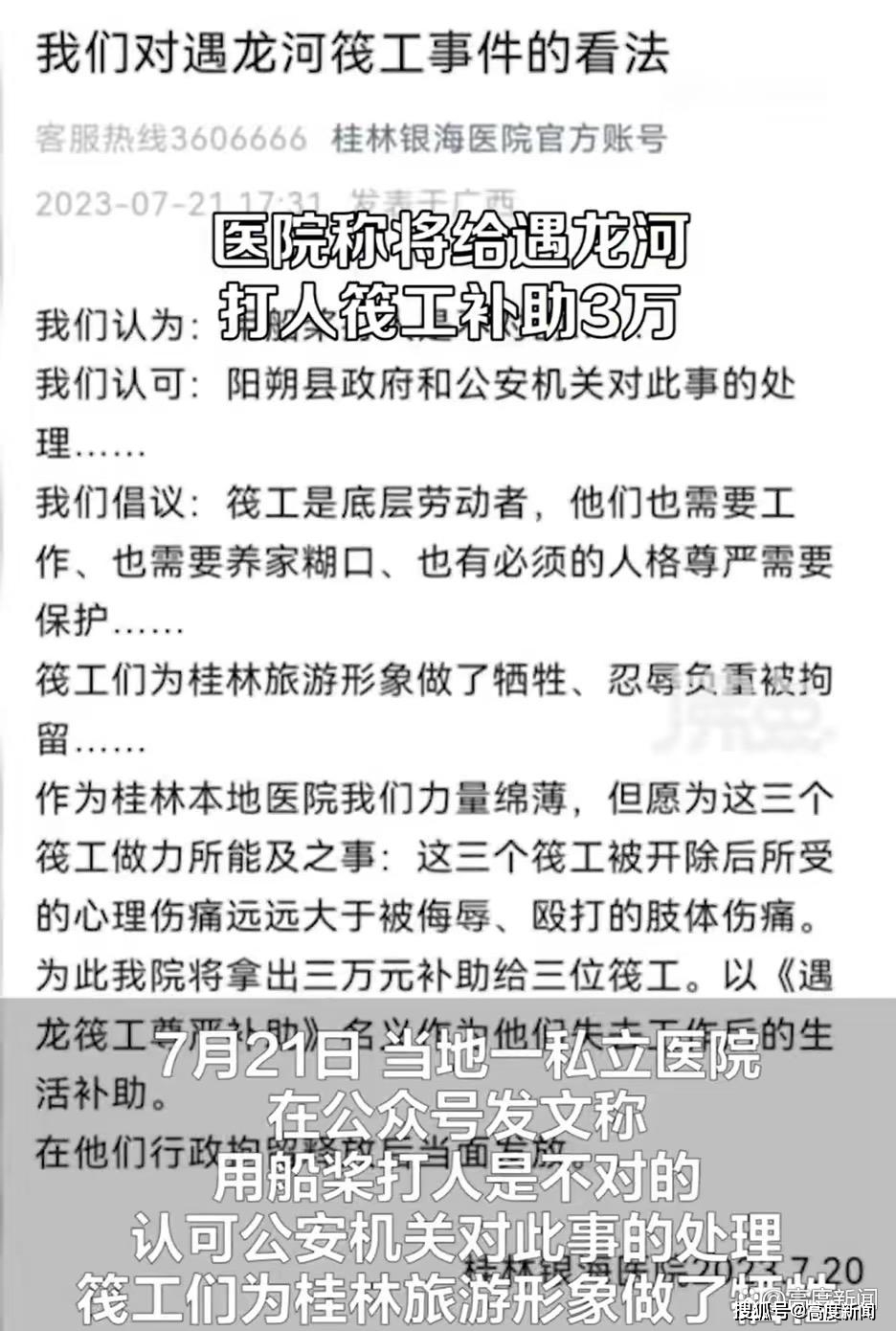 7月21日,当地一私立医院在公众号上发文称,“我们认为用船桨打人是不对的,认可公安机关对此事的处理。”“筏工们为桂林旅游形象做了牺牲、忍辱负重被拘留。”