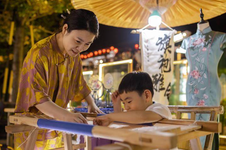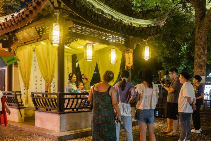 在汉服氛围“拉满”的古镇摆摊啥感觉?“很不一样,有穿唐制的汉服游客拿我的瓷盘作品随便摆几个Pose,配上夏夜微雨,‘大珠小珠落玉盘’的画面有了。”袁老师告诉记者,武林夜市里更多游客是围观瓷刻技艺,但在西塘古镇,瓷刻成了一件能和游客互动的艺术品。