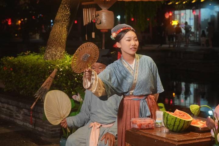 “碧蔓凌霜卧软沙,年来处处食西瓜。”7月21日晚上8点,西塘古镇三埭街“十二月市汉服集市”上,一对身着汉服、当街售卖西瓜的“卖瓜爷孙”火了。00后“孙女”小包是本地人,旁边的“爷爷”则是自己的邻居爷爷。“刚好西塘在办汉服夜市,我就和邻居爷爷穿上汉服来着卖瓜。”这波“汉服卖瓜”开业即火爆,有路过的买瓜群众调侃,“连路过的蚂蚁都要感慨一句浪漫。”