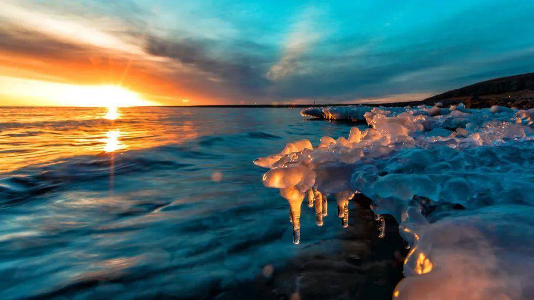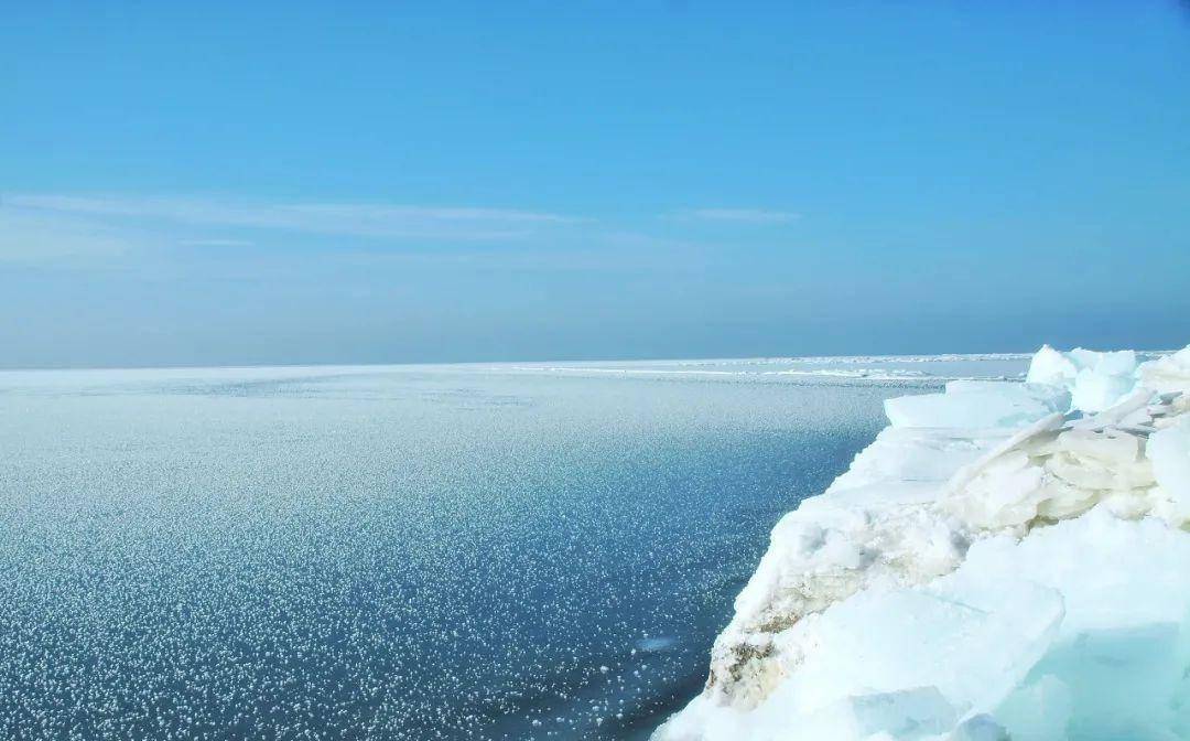 浩瀚碧绿的湖面,在寒风中慢慢冻结、静止,如披上了一层银装素裹。