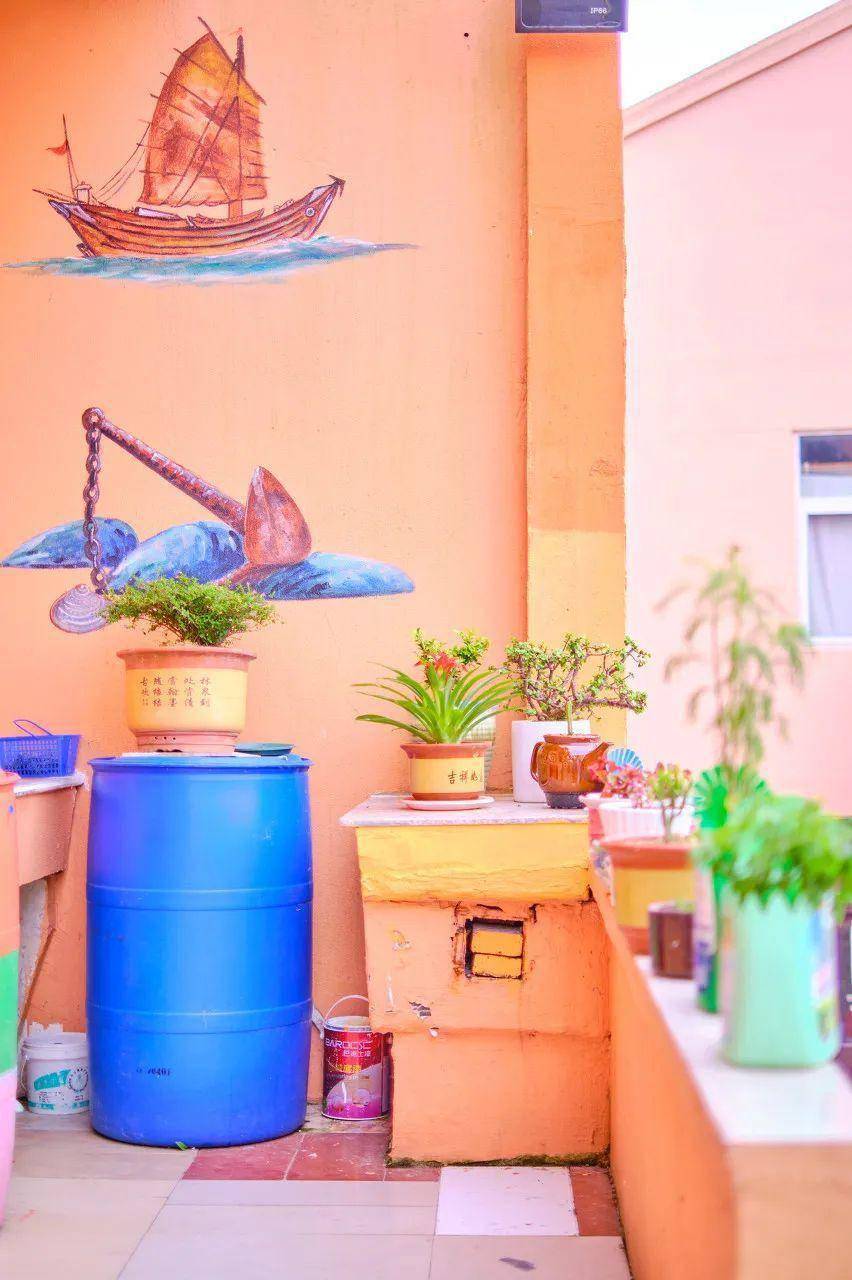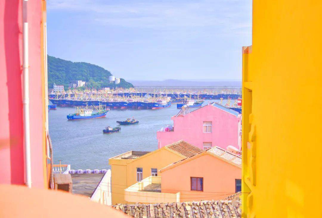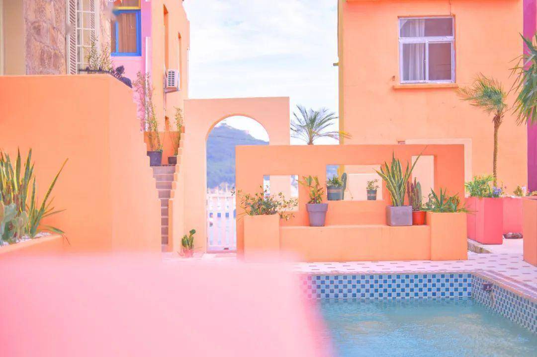 马卡龙色彩的小房子,在蓝色的大海边,就像是从童话中走出来的。