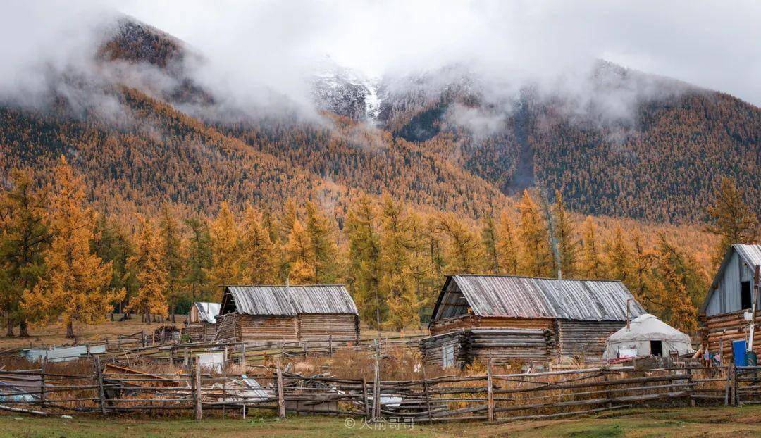 清晨塔川被云雾笼罩,秋色和小屋在白雾中若隐若现,远远望去诗意满满。