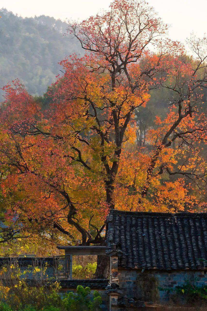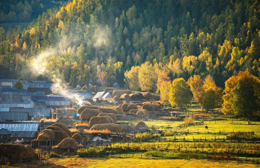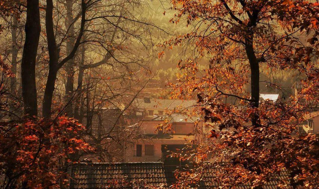 红、黄、绿、褐色...加上清晨的袅袅炊烟,整个村庄变得宁静而悠然。
