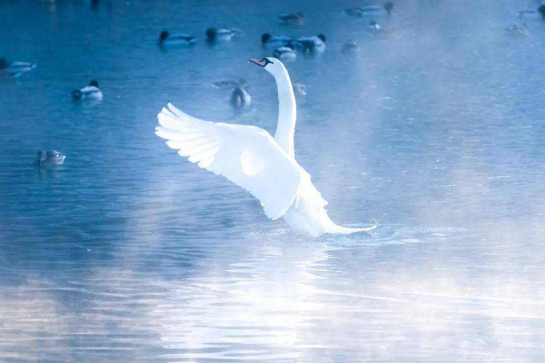 十一月下旬的天鹅泉已经开始变成了美丽的童话,水雾缭绕的湖面、自由自在的天鹅、银装素裹的雾凇...