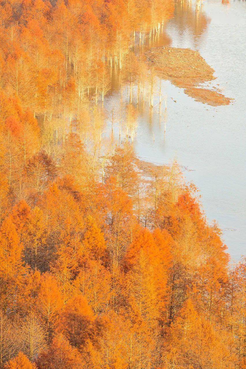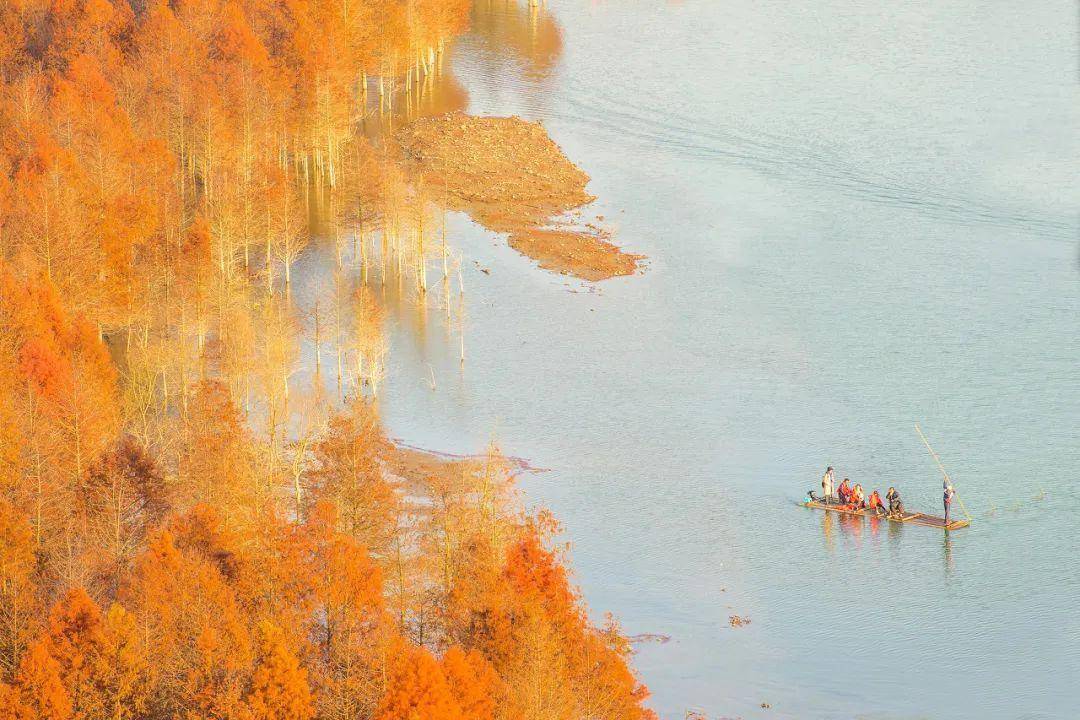 万亩水杉沿着浅浅的湾流排列,与清澈的水面相互映衬,组成一幅美丽的画卷。