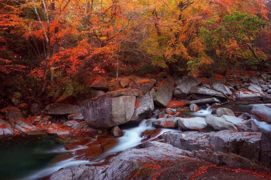 溪水从山顶潺潺流下,溪边是斑斓的彩叶,红的、黄的、橙的...美不胜收。