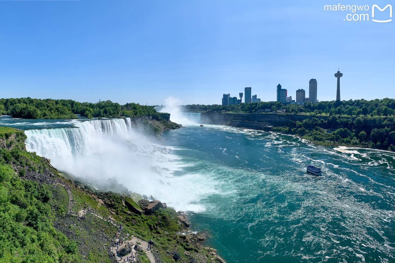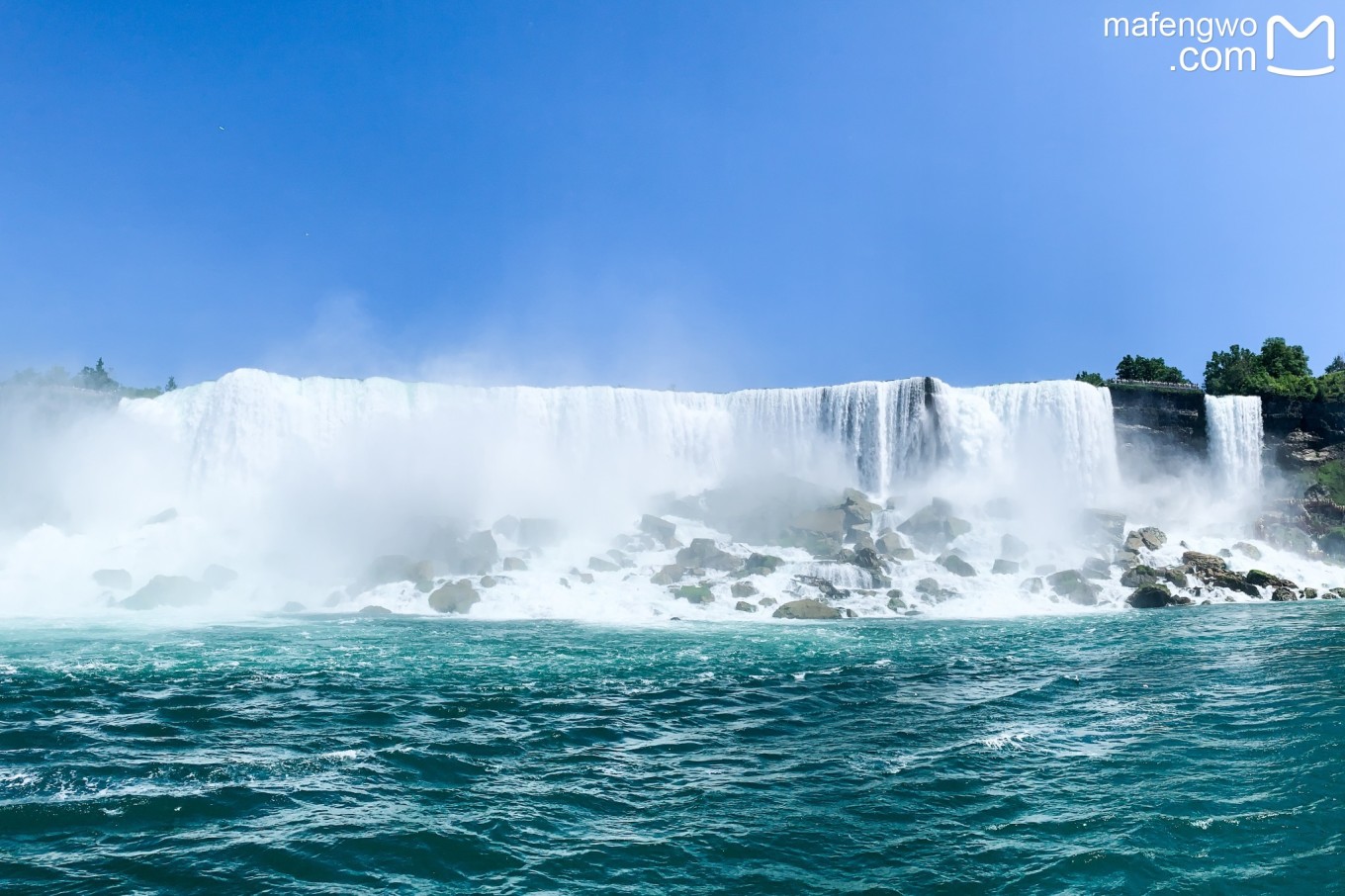 美国 瀑布水线长335米、落差54米,与窄窄的新娘面纱瀑布以岩壁上的一块凸起相隔。这块凸出的岩石叫“月亮岛”(Luna Island),据说从前,在满月之夜,水雾中会出现月光彩虹,因而得名。如今如此浪漫的景色没有了,夜间从 加拿大 一侧照射过来的强光灯,制造了另一种人工的旖旎。月亮岛也有岩石松落的问题,也曾几次加固,否则新娘面纱与 美国 瀑布早就合二为一了。岛上还有一个竖井,可以让游客下到瀑布底下仰望。